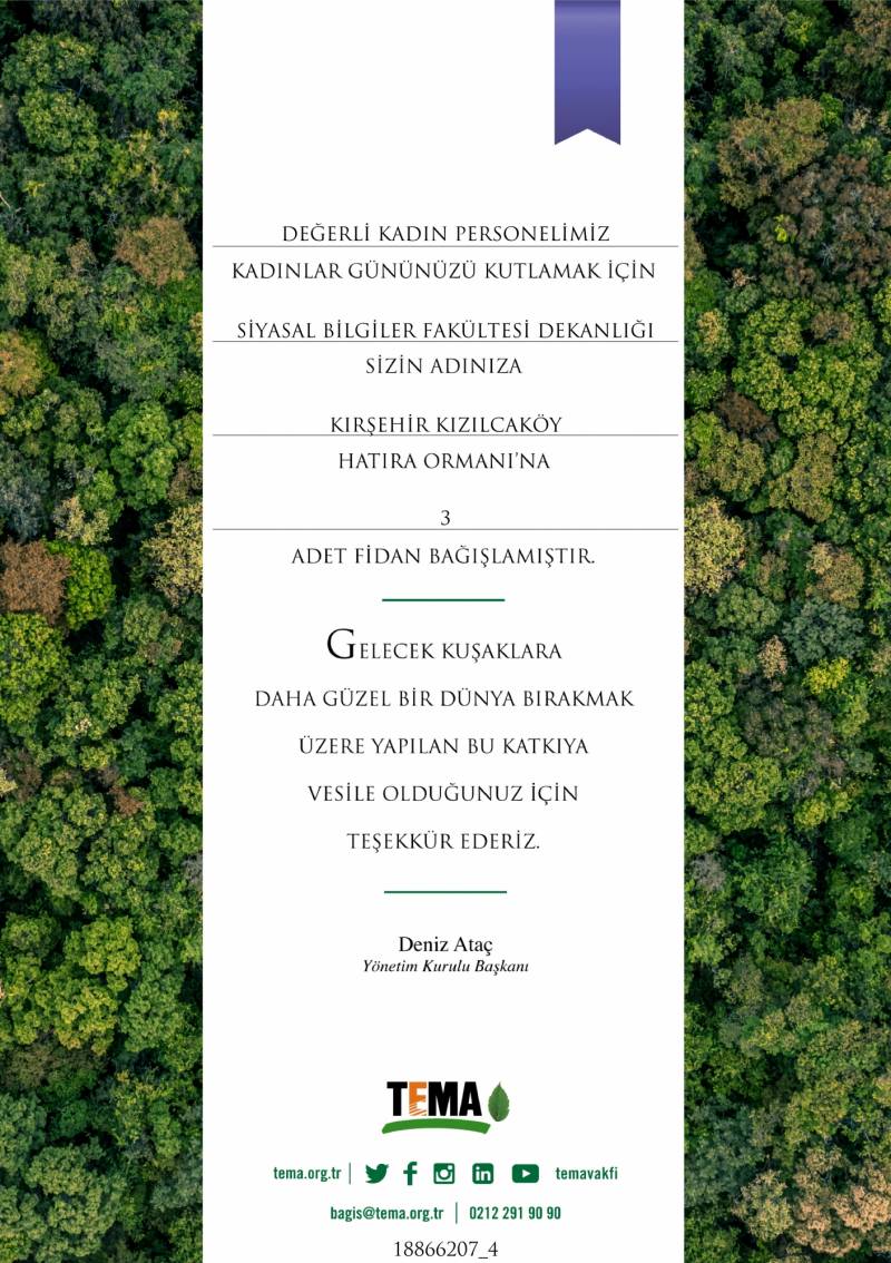 8 Mart Dünya Kadınlar Günü kapsamında Fakültemiz kadın personeli adına, TEMA Vakfı aracılığıyla fidan bağışında bulunduk.