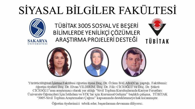 Yürütücülüğünü İşletme Fakültesi öğretim üyesi Doç. Dr. Özlem BALABAN’ın yaptığı, Fakültemiz öğretim üyeleri Doç. Dr. Elvan YILDIRIM, Doç. Dr. Filiz CİCİOĞLU ve Doç. Dr. Şükrü CİCİOĞLU’nun araştırmacı olarak yer aldığı "Sivil Toplum Kuruluşlarında Kariyer Fırsatları: Üniversite Öğrencileri İçin İstihdam ve STK’lar için Kurumsal Gelişim" başlıklı çalışma, TÜBİTAK “3005-Sivil Toplum Araştırmaları Çağrısı” kapsamında desteklenmeye hak kazanmıştır.