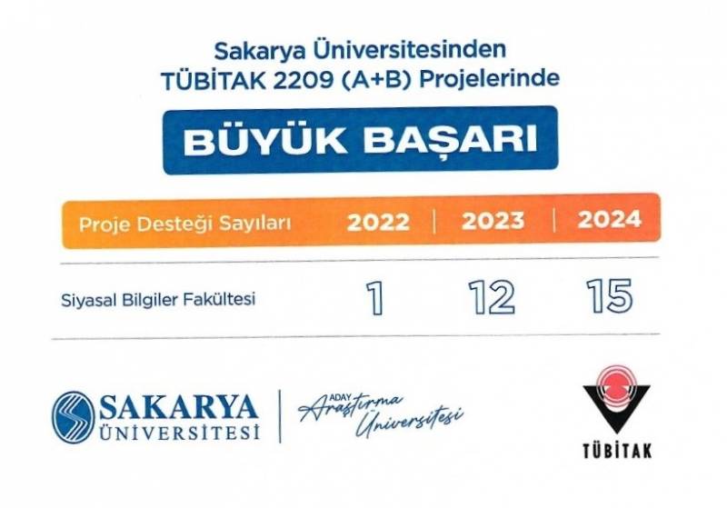 Sakarya Üniversitesi Siyasal Bilgiler Fakültesi, TÜBİTAK 2209-A ve 2209-B Üniversite Öğrencileri Araştırma Projeleri Destekleme Programı kapsamında gösterdiği performansla dikkat çekiyor. Fakültemiz, 2022 yılında yalnızca 1 proje desteği alırken, 2023 yılında bu sayıyı 12’ye, 2024 yılında ise 15’e yükseltti.