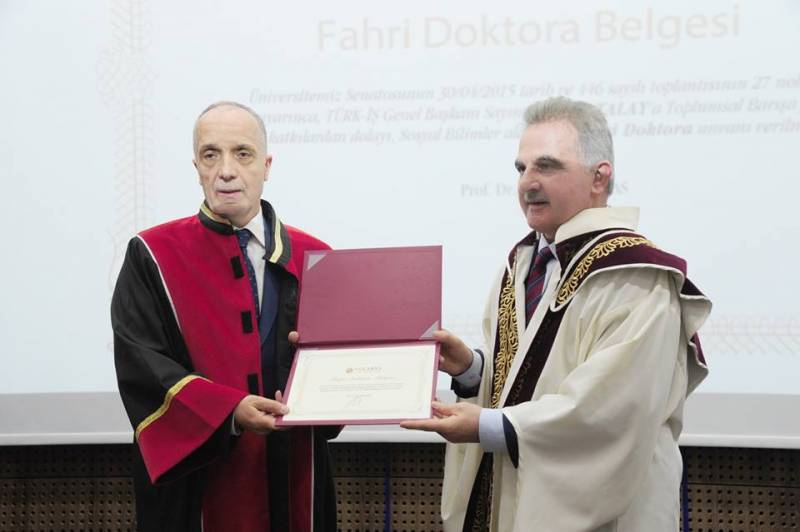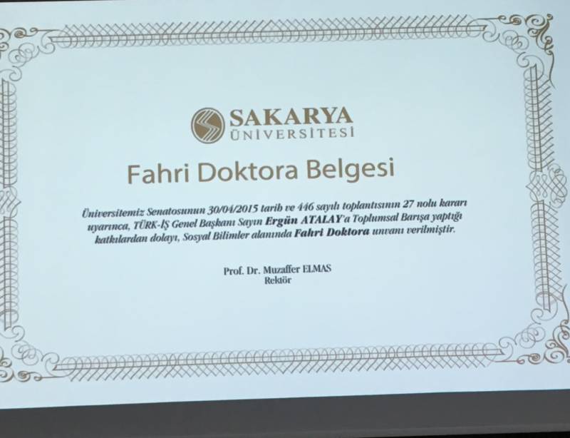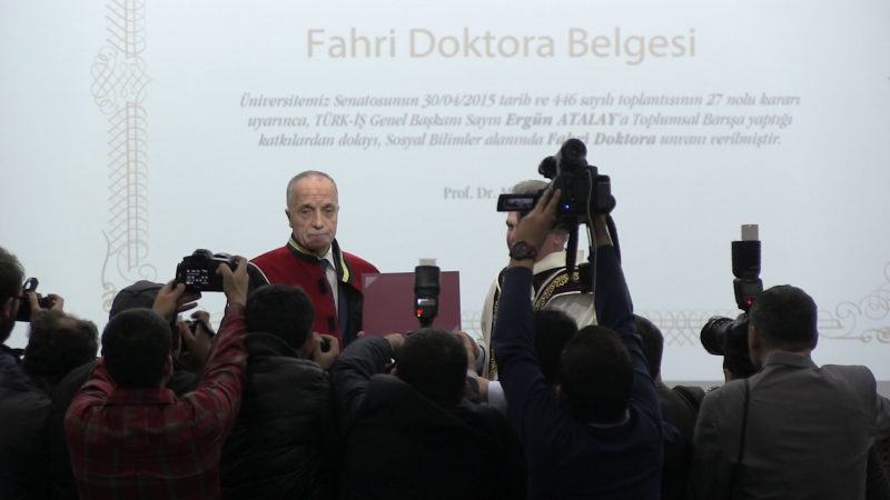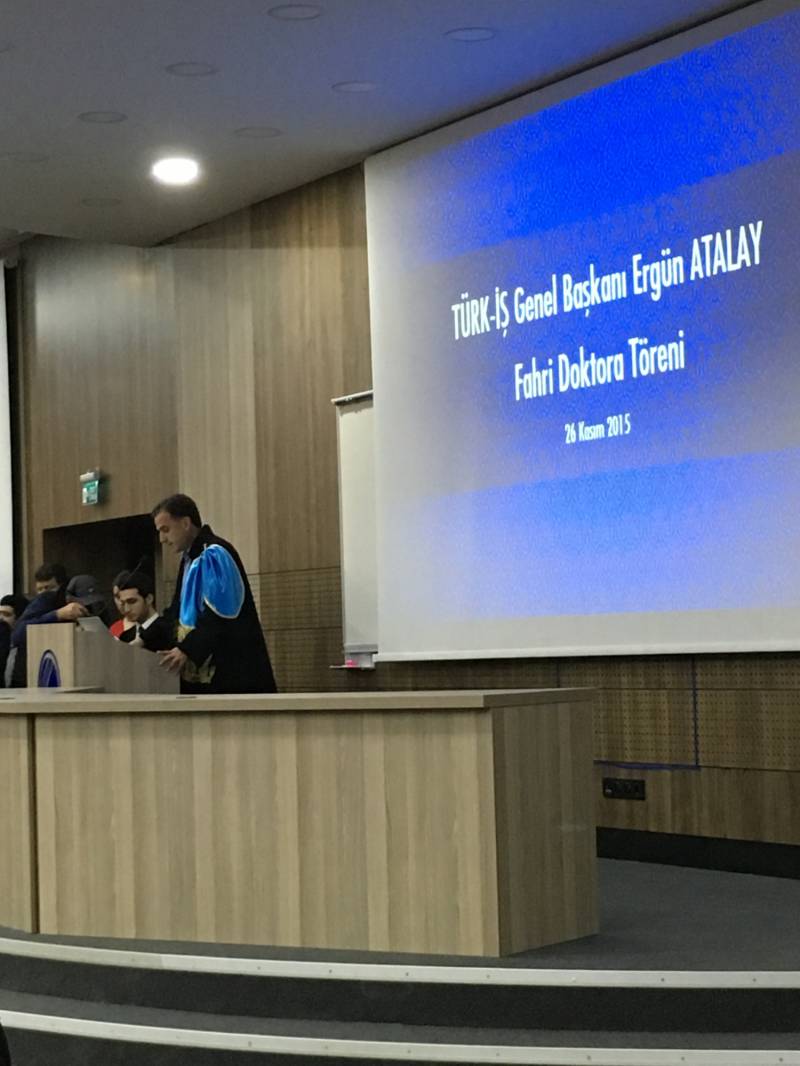 Üniversitemiz tarafından, 26 Kasım 2015 günü düzenlenen törenle, TÜRK-İŞ Genel Başkanı Ergün Atalay’a, Toplumsal Barışa yaptığı katkılardan dolayı Sosyal Bilimler alanında fahri doktora unvanı verildi.