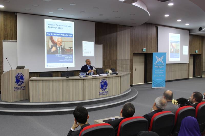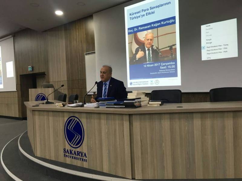 Fakültemiz tarafından 12/04/2017 Çarşamba günü saat 15.00'da Doç. Dr. Ramazan Kağan Kurtoğlu’nun katılımlarıyla “Küresel Para Savaşlarının Türkiye’ye Etkisi” konulu bir konferans düzenlendi.