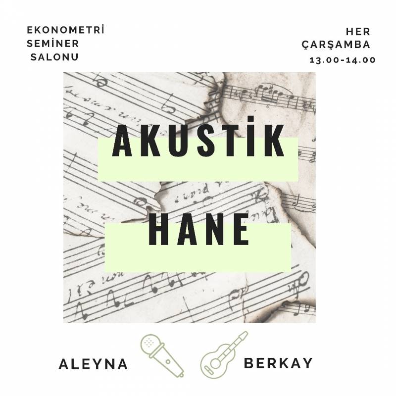 Fakültemiz Ekonometri Bölümü öğrencilerinden Aleyna ve Berkay' ın gerçekleştireceği "Akustik Hane" etkinliğine katılıp iyi vakit geçirmek isteyen herkesi Çarşamba günleri 13.00-14.00 saatleri arasında Ekonometri Seminer Salonu'na bekliyoruz.