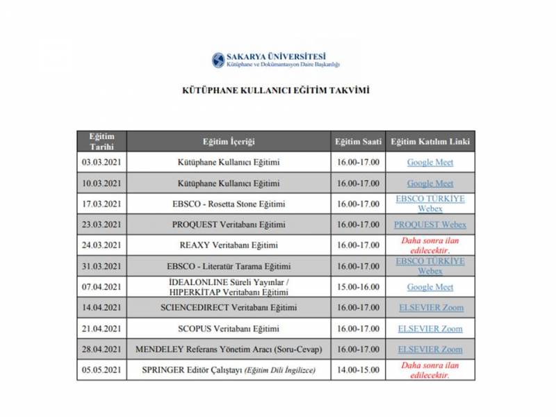 Uzaktan eğitim alan öğrencilerimize elektronik bilgi kaynaklarının kullanımını ve araştırma süreçlerine katkı sağlayacak çeşitli araçları anlatmak amacıyla Kütüphane ve Dokümantasyon Daire Başkanlığı tarafından ekteki tabloda belirtilen "Çevrimiçi Kütüphane Kullanıcı Eğitimleri" düzenlenmektedir. Öğrencilerimizin bu eğitimlere katılması kendilerine katkı sağlayacaktır.